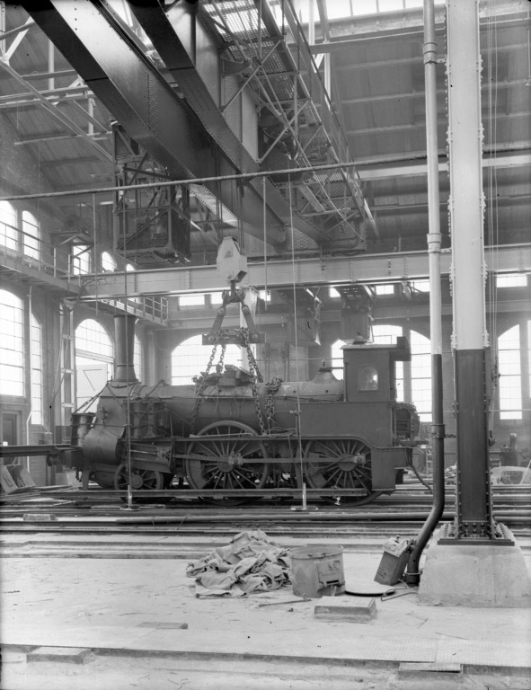 >>> Interieur van stelplaats IV van de Centrale Werkplaats van de H.S.M. te Haarlem: hal 24, tijdens het beproeven van één van de twee loopkranen met behulp van de stoomloc. nr. 4 "Diana" (serie 1-15, 26-30) van de H.S.M. Datering: Tussen 01-01-1914 en 31-12-1914.