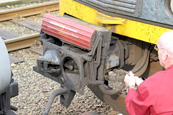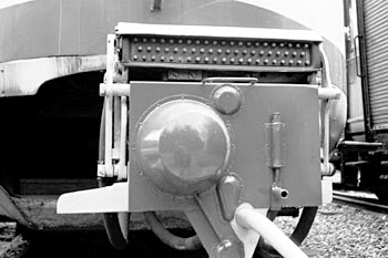 <<< Spoorwegmuseum, 9 juni 1973. Opengeklapte Scharfenbergkoppeling van treinstel 27. Duidelijk te zien zijn de koperen contacten die voor de elektrische verbindingen zorgen.