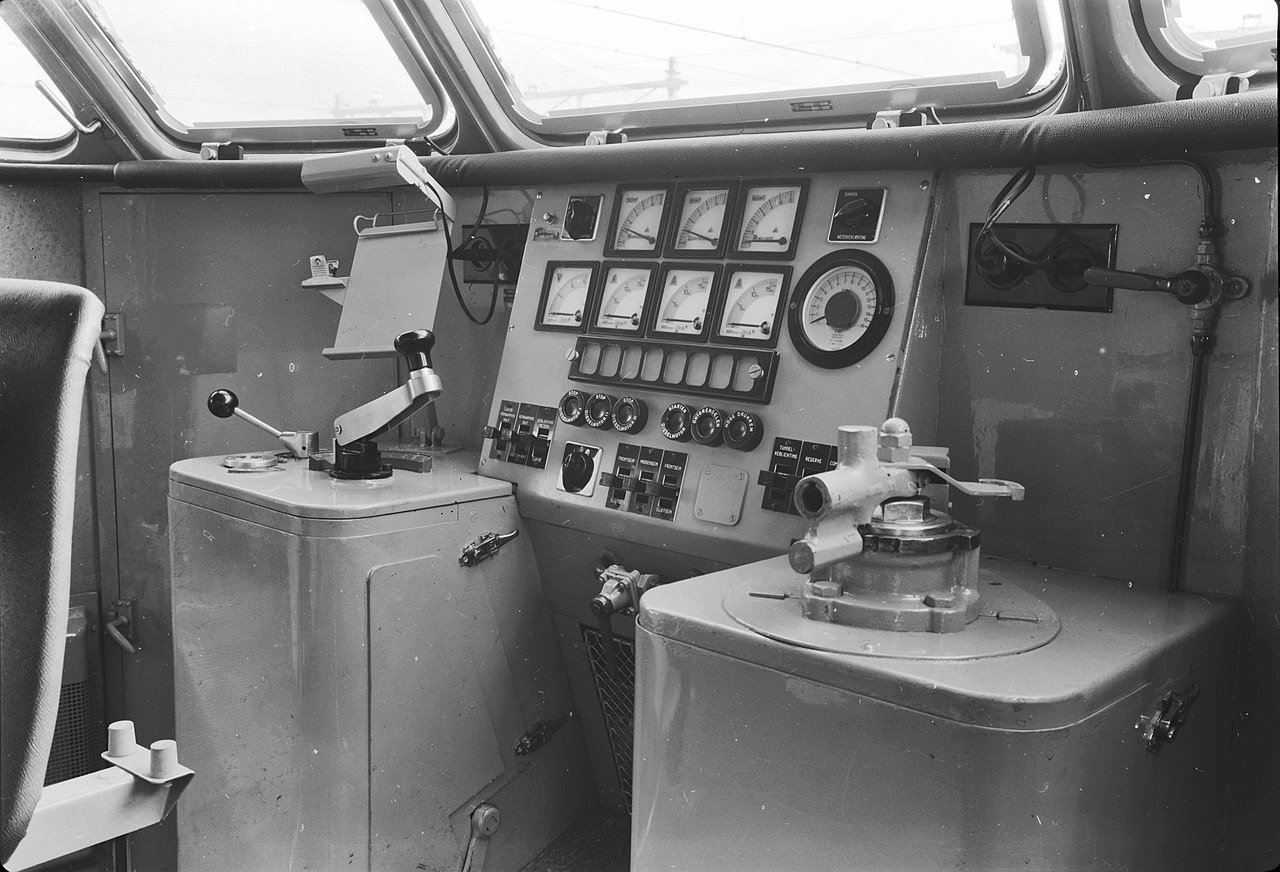 <<< Catalogusnummer: 151273. De stuur-stand van een diesel-electrisch treinstel DE 3 (plan U) van de N.S. te Geldermalsen.