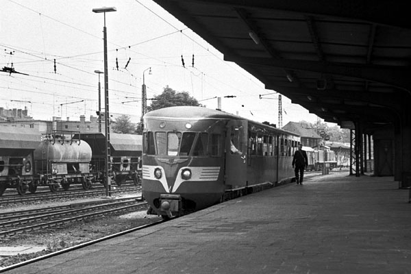 Diesel-elektrisch motorrijtuig ("Blauwe Engel") van de N.S. langs het perron van het N.S.-station Hoogezand-Sappemeer te Hoogezand. Datering: Tussen 01-01-1975 - 31-12-1979.