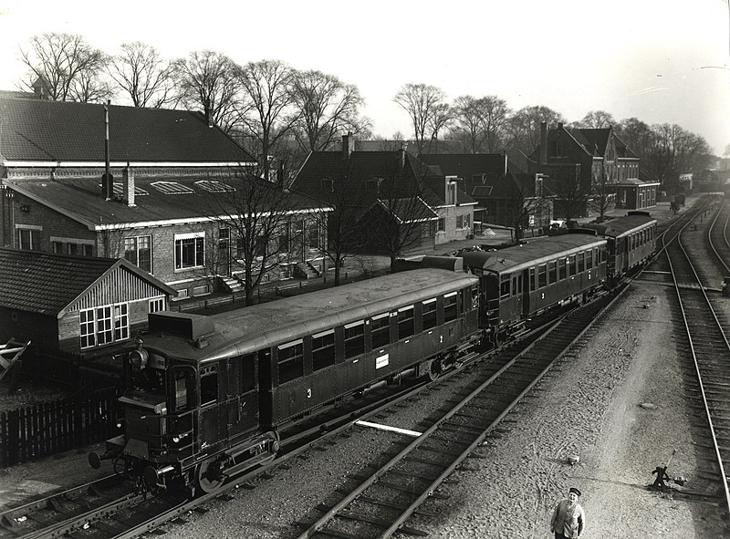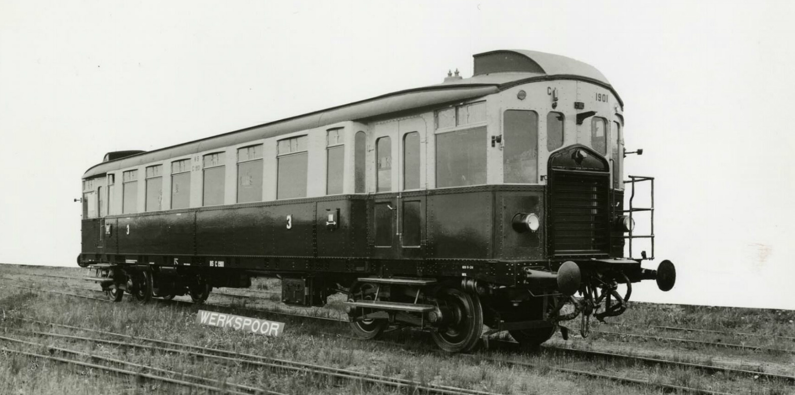 Drie gekoppelde benzine motorrijtuigen met voorop het benzine motorrijtuig nr. BC 1901 (serie omBC 1901-1903) van de N.S. bij vertrek uit Zwolle richting Kampen. Datering: Tussen 01-01-1924 en 31-12-1934. Foto: Nederlandse Spoorwegen - Het Utrechts Archief / hetutrechtsarchief.nl - Opm.: Afbeelding behoort tot de Collectie De Pater.