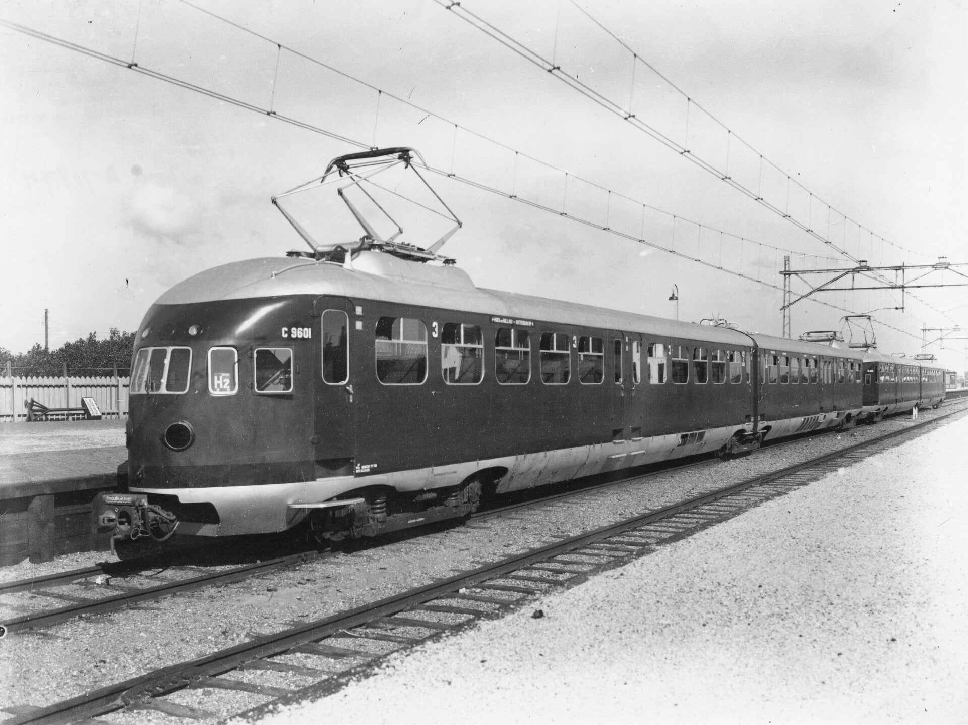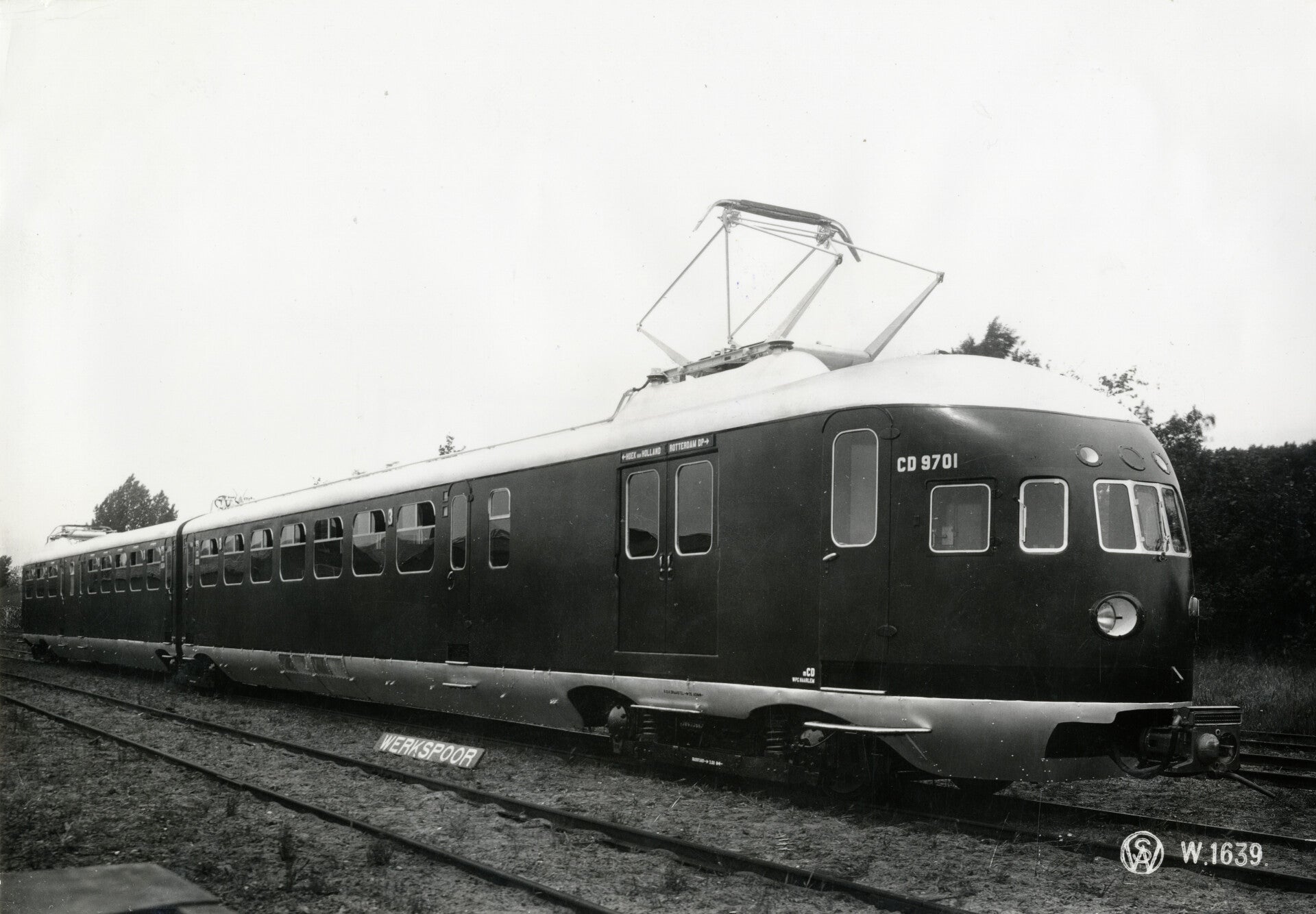 Het fabrieksnieuwe elektrische treinstel nr. mCD 9701 (mat. 1935, serie mCD 9701-9704, later nrs. 204-206, 208, "Hoek van Hollanders") van de N.S. op het terrein van Werkspoor te Zuilen.
