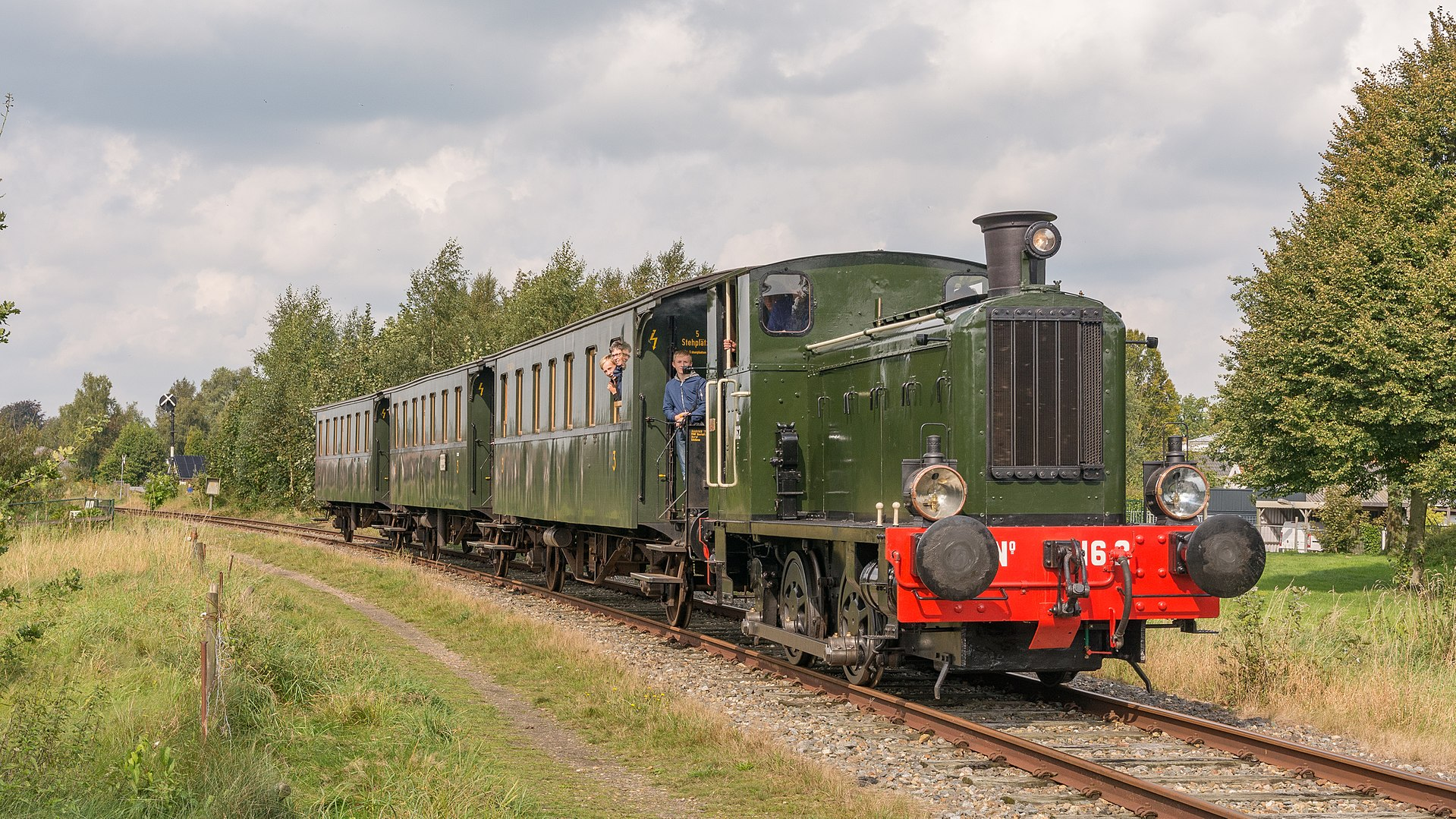 2.13. Vanuit Veendam rijdt bij Wildervank gastlocomotief, ex-NS 2454 met passagierstrein 3953 naar Stadskanaal. Aan de haak hangen SSN rijtuigen. Datering: 17-09-2017.
