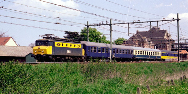 Woerden, 10 mei 1982. NS Loc 1158 is met een paar lege rijtuigen op weg naar de werkplaats Leidschendam. Het achterste rijtuig is een van de buffetrijtuigen van de Biljettencentrale. Dit zijn verbouwde Duitse rijtuigen, bij NS genummerd 51848840001 t/m 7, die in 1978 in dienst zijn gekomen en in 1994 zijn afgevoerd. In spoorkringen werden ze ook wel krokettenkar genoemd.