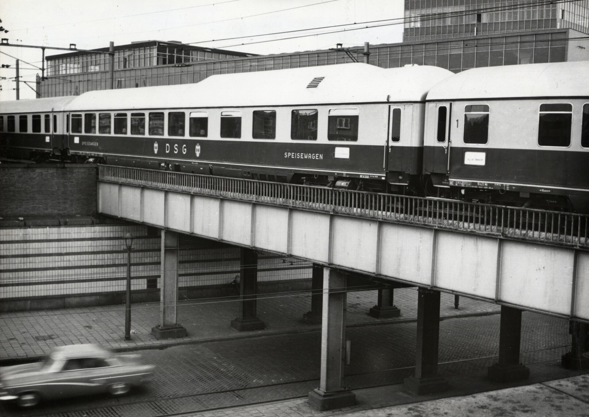 De "Speisewagen" (restauratierijtuig) van de Deutsche Schlafwagen und Speisewagen Gesellschaft (D.S.G.) in de internationale trein "Rheingold" op het viaduct over de Meester Treublaan bij het N.S.-station Amsterdam Amstel. Datering: 26-05-1962.