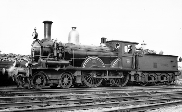 Stoomlocomotief nr. 105 uit de serie 101-109 van de N.R.S. in 1891 omgenummerd als nr. 354 uit de serie 350-408 van de H.S.M. en later omgenummerd als nr. 1605 (serie 1600) van de N.S. Datering: Tussen 01-01-1889 en 31-12-1889.