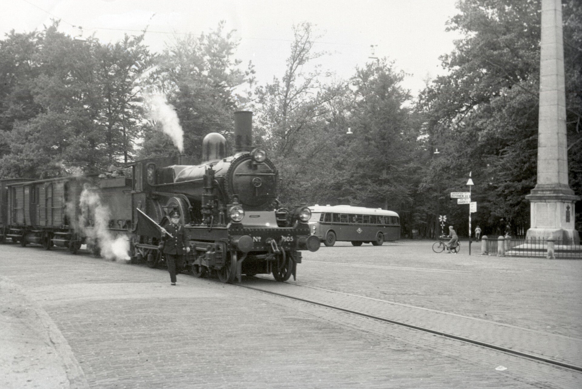 Stoomlocomotief nr. 1805 (serie 1700/1800) van de N.S. met een trein op de wegkruising bij de gedenknaald bij Het Loo te Apeldoorn. Datering: Tussen 01-01-1950 en 31-12-1950. Foto: Nederlandse Spoorwegen - Het Utrechts Archief / hetutrechtsarchief.nl - Opm.: Afb. behoort tot de collectie De Pater. Licentie: Publiek Domein