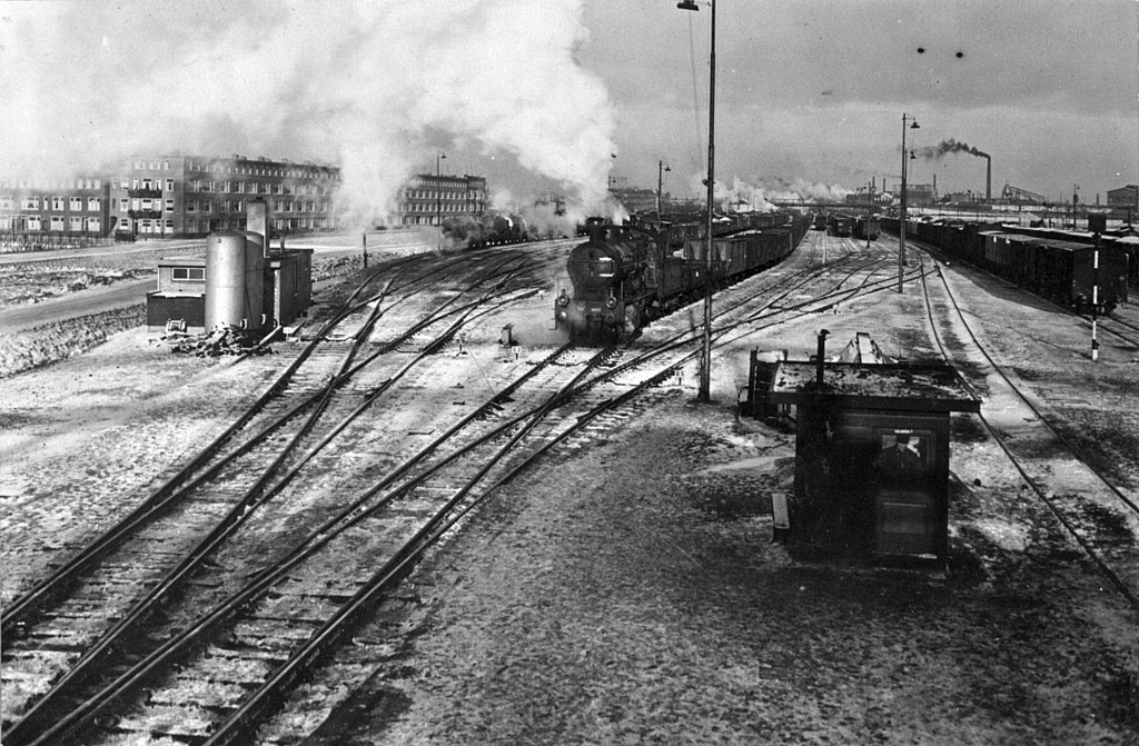 Gezicht op het perron van het N.S.-station Roermond, met links stoomloc NS 4603 (serie NS 4600) en op de achtergrond enkele seinbruggen en de tijdelijk opnieuw in gebruik genomen locomotiefloods, 12-07-1940.