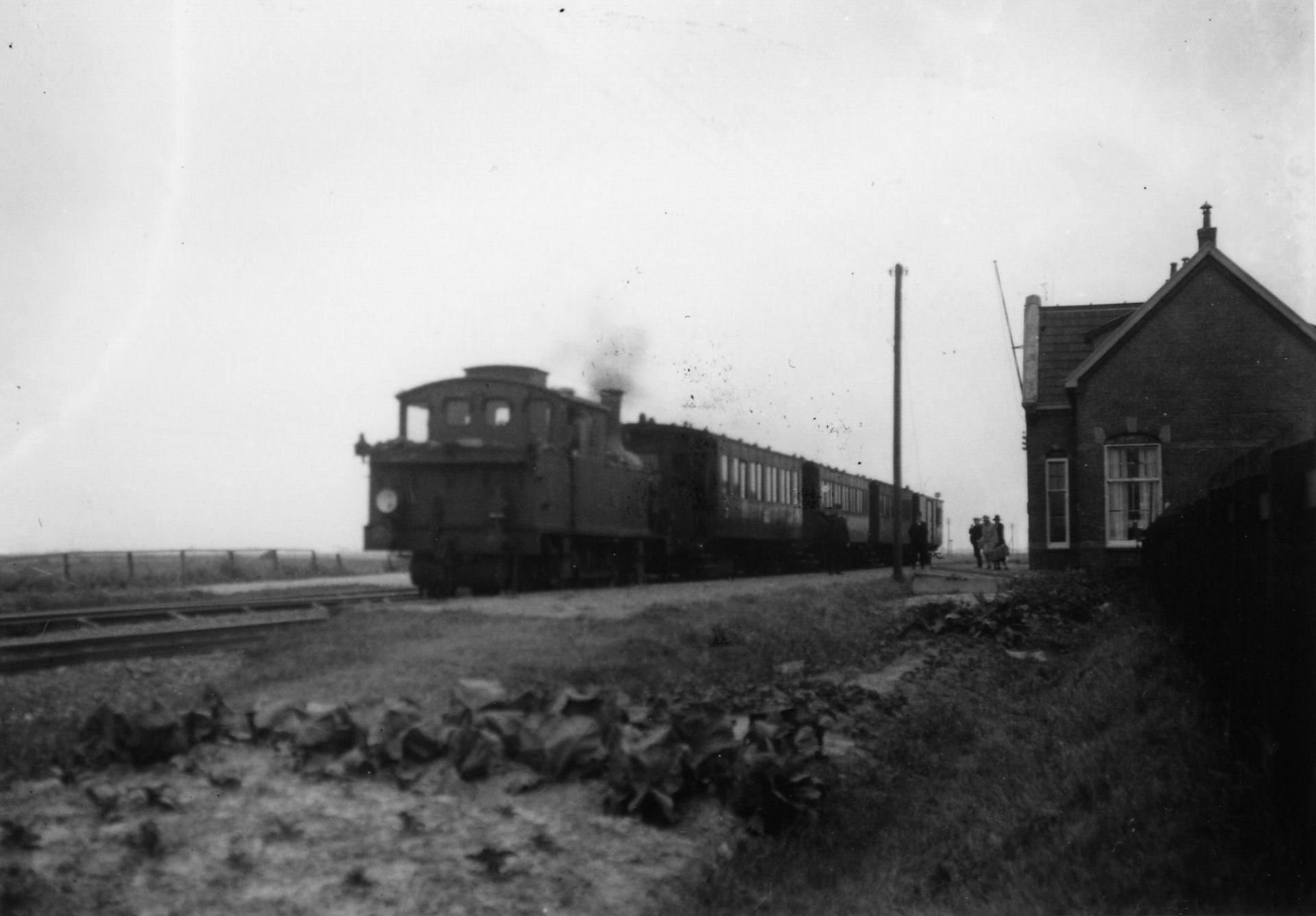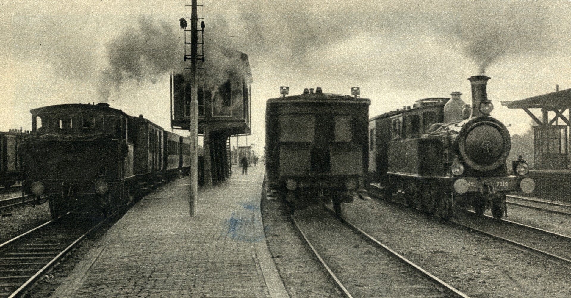 Enkele treinen langs het perron van het N.S.-station Uithoorn, met rechts de stoom-locomotief nr. 7116 (serie 7100) van de N.S. Datering: September 1935.