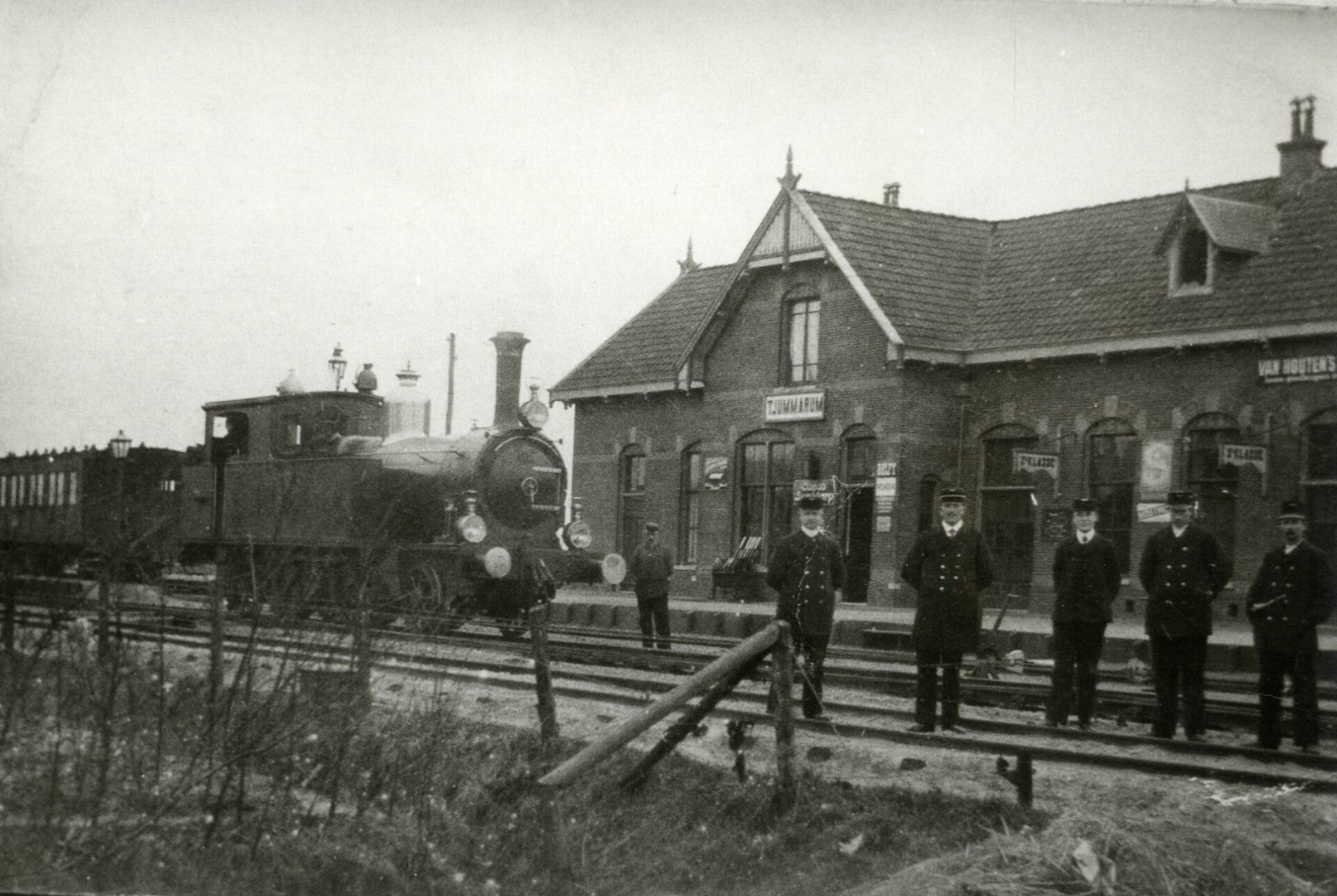Stoomlocomotief nr. 1059 (serie 1050-1060) van de H.S.M. (later serie 7100 van de N.S.) met een trein langs het perron van het station Anjum van de N.F.L.S. Datering: Tussen 01-01-1913 en 31-12-1920.