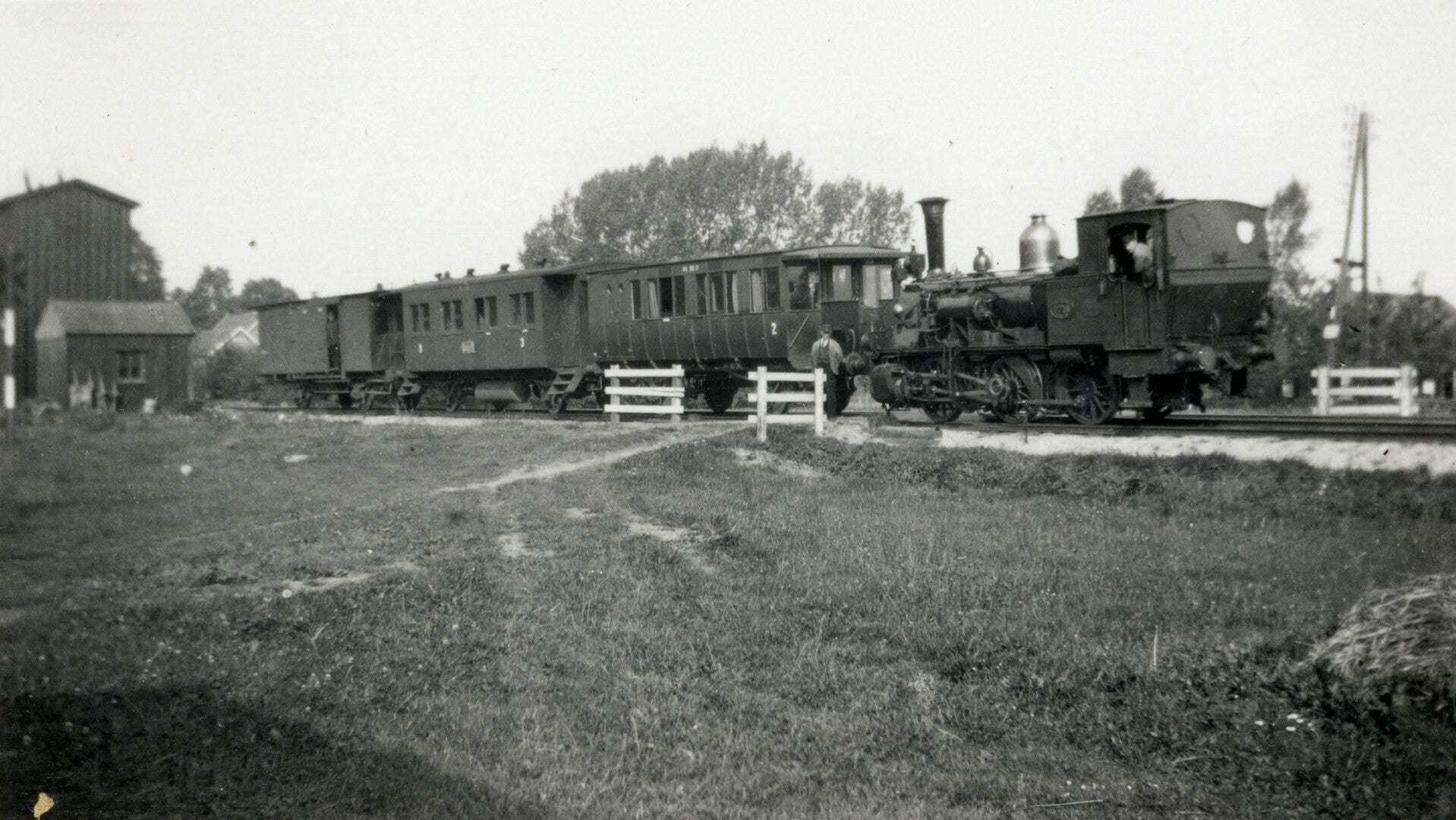 Stoomlocomotief nr. 7743 (serie 7700, "Bello") van de N.S. met een tram nabij Egmond aan de Hoef. Datering: Tussen 01-01-1934 en 31-12-1934.