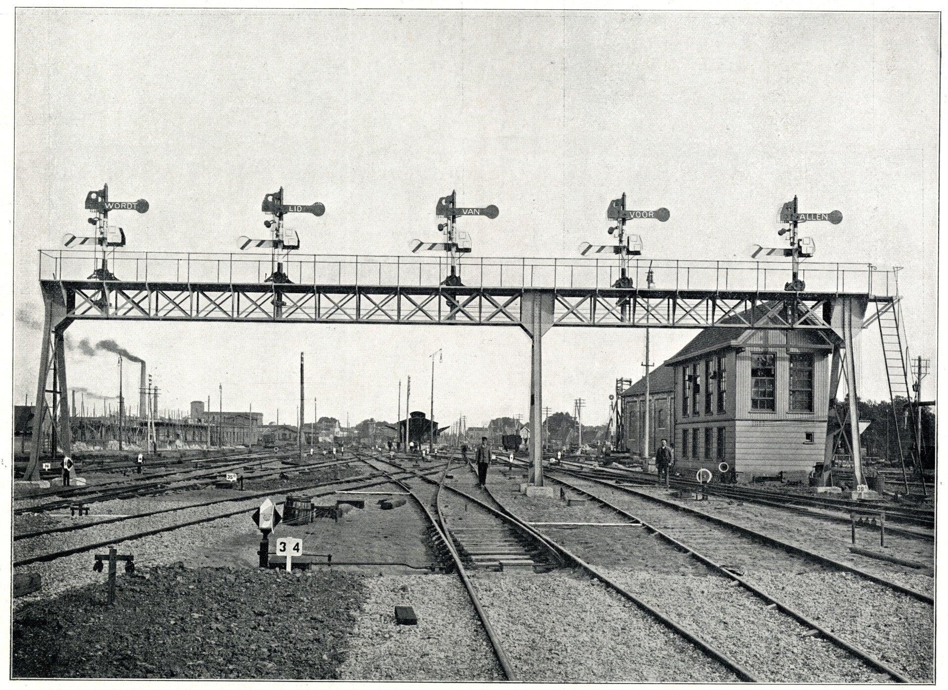 <<< Catalogusnummer: 812110 - Het empla-cement van het H.S.M.-station Almelo, met op de voorgrond de seinbrug met op de seinen de reclameleus "wordt lid van voor allen" (Coöperatieve Vereniging Voor allen der H.IJ.S.M.). Rechts een seinhuis. Datering: Tussen 01-01-1910 en 31-12-1910. Foto: Onbekend - Het Utrechts Archief / hetutrechtsarchief.nl - Licentiestatus:  Publiek Domein