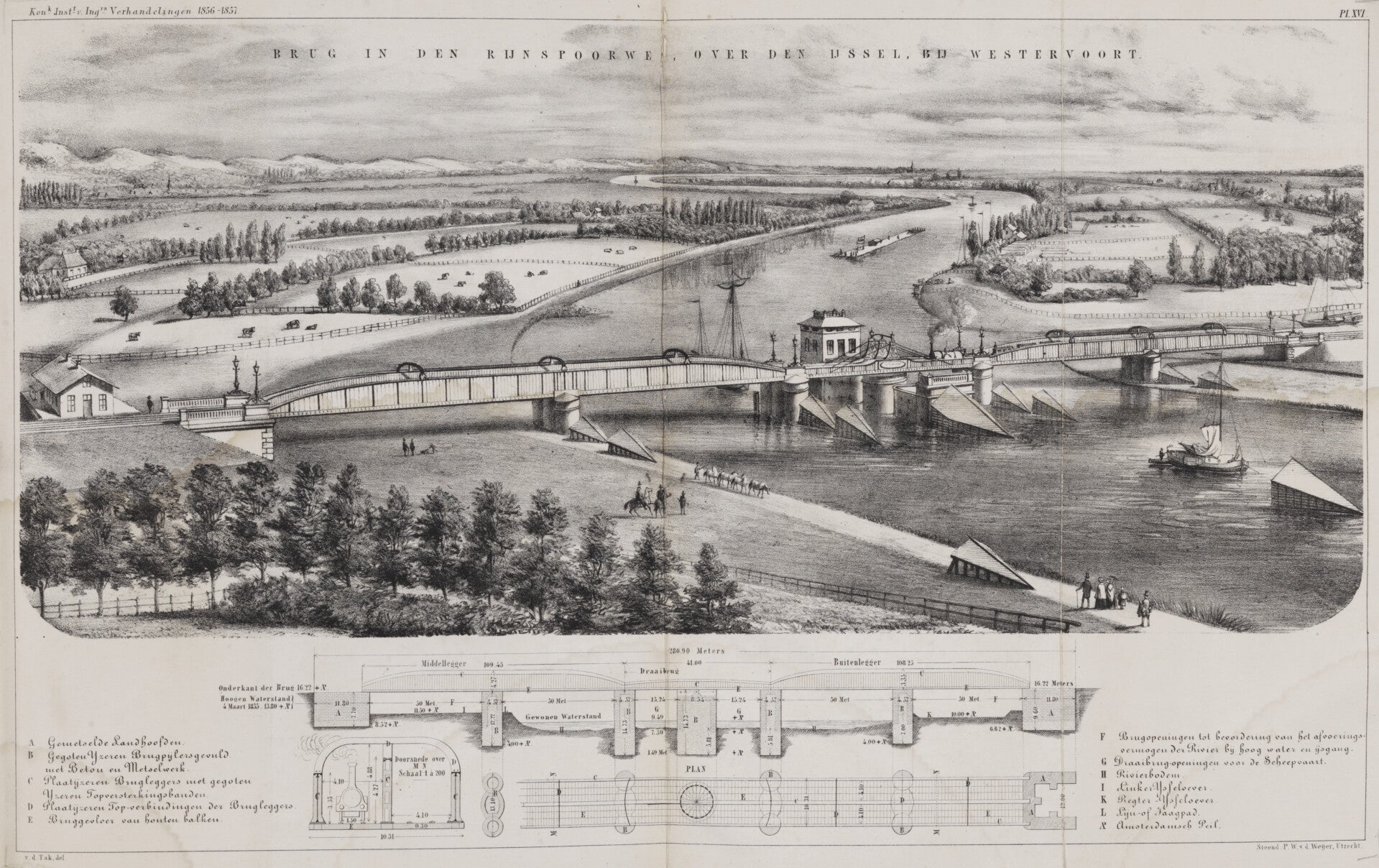 De spoorbrug van de Nederlandsche Rhijnspoorweg-Maatschappij (NRS) over de IJssel bij Westervoort, uit het westen, met daaronder een zijaanzicht, dwarsdoorsnede en bovenaanzicht van de brug. Datering: Tussen 01-01-1856 en 31-12-1856.